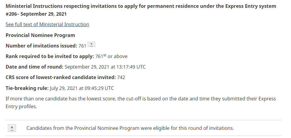 加拿大當地時間2021年9月29日,EE(express entry)系統發放了第206次邀請。本輪只邀請了省提名類PNP申請人,共發放了761份邀請,最低742分獲邀。較上次省提名抽分結果上升10分!