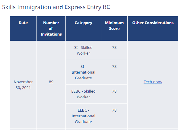 加拿大當地時間2021年11月30日,BC PNP Tech 發布最新一輪抽分結果。本輪Tech項目各項分數是78分,邀請人數為89人。較上輪邀請分數上漲3分,邀請人數增加2人。