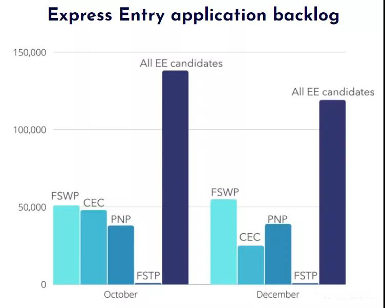 加拿大移民、難民和公民部 (IRCC) 在 1 月 4 日公布了快速通道候選人的細分數據。截至 2022 年 1 月 4 日,Express Entry 池子有近 19.4 萬名候選人。其中 80% 是FSW 候選人,超 15.4萬人,CEC 候選人有約 3.8萬人。