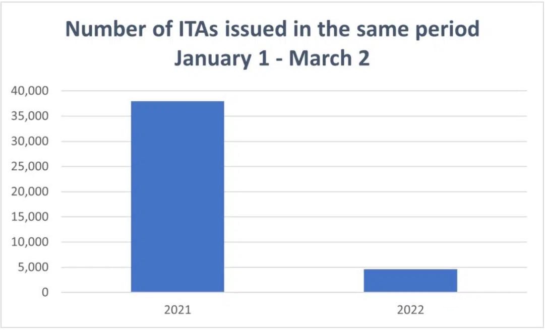 2022年截至到現在,聯邦EE共發放4627份邀請,去年同期,移民局發放了37986份邀請。