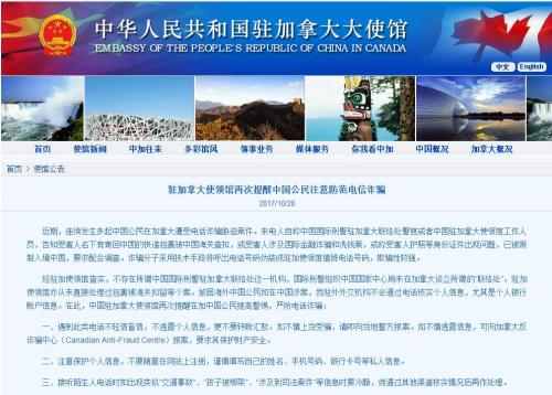 經駐加使領館查實,不存在所謂中國國際刑警駐加拿大聯絡處這一機構,國際刑警組織中國國家中心局未在加拿大設立所謂的“聯絡處”。駐加使領館亦從未直接處理過包裹被海關扣留等個案。旅居海外中國公民如在中國涉案,我駐外外交機構不會通過電話核實個人信息,尤其是個人銀行賬戶信息。在此,中國駐加拿大使領館再次提醒在加中國公民提高警惕,嚴防電話詐騙:
