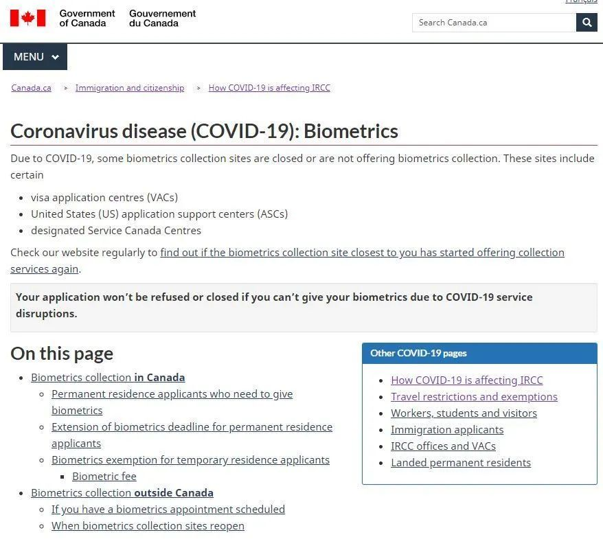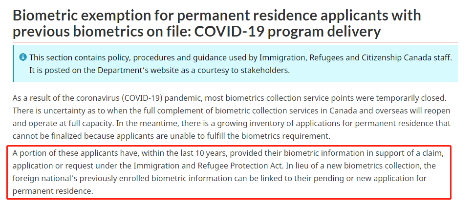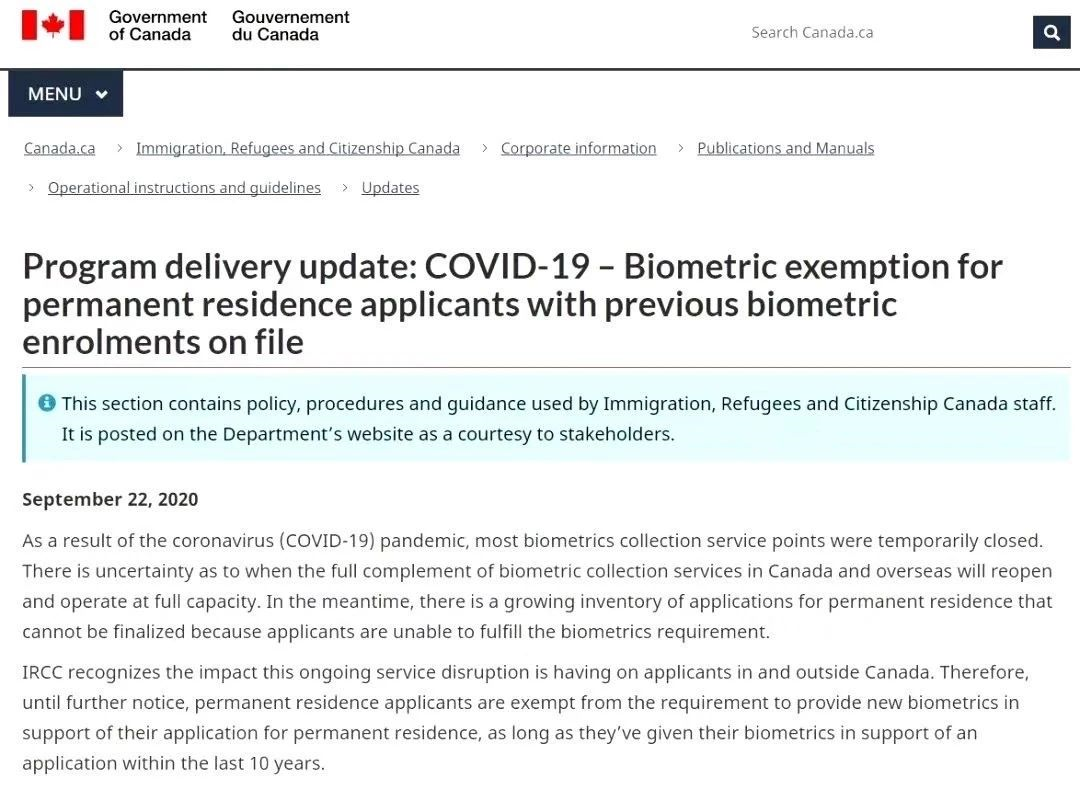 加拿大移民局官網(wǎng)在最近更新了一條關(guān)于豁免部分PR申請(qǐng)人錄指紋需求的通知,進(jìn)一步放寬了疫情下移民申請(qǐng)人指紋采集的要求:
