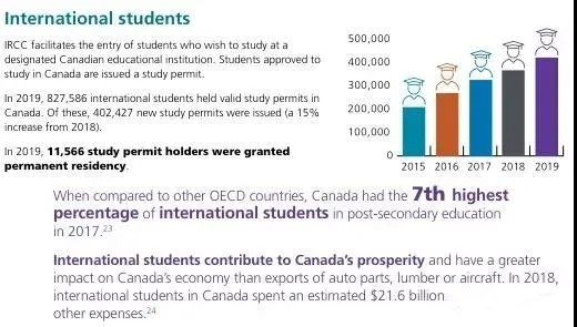 留學生繼續大受青睞。人數逐年增加;相較于2015年發放的20萬份學生簽證,2019年簽發402,427份新生簽證, 幾乎漲了一倍數量,比2018年也上漲15%。在OECD國家中, 留學生人數排名第7位,與此同時,國際留學生對加拿大的貢獻也超過216億加元。