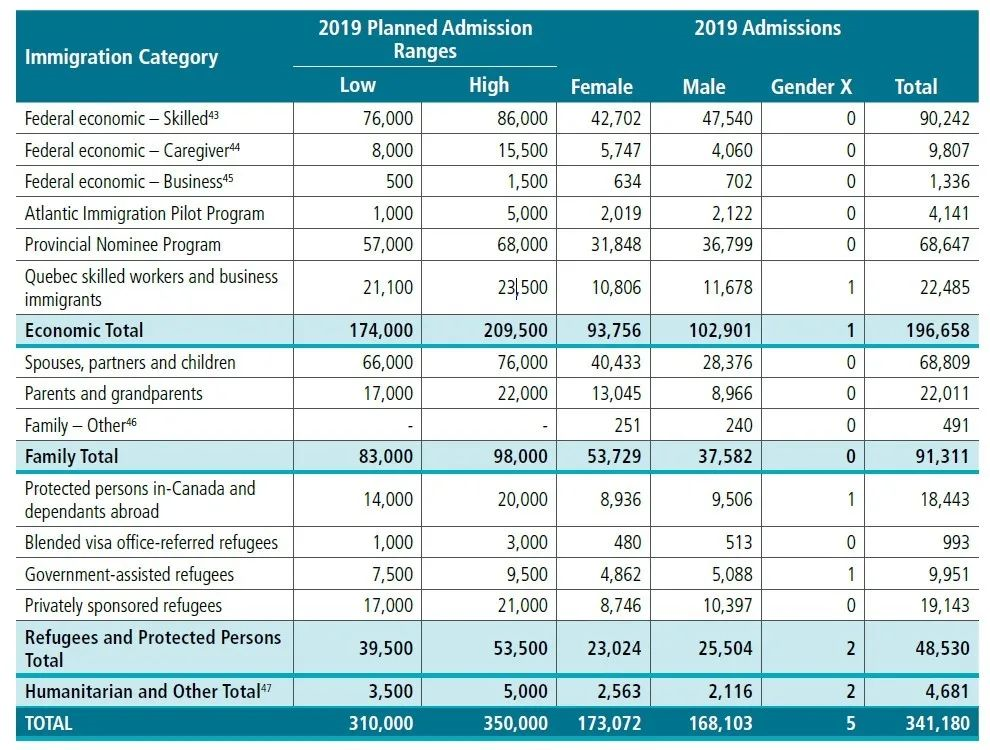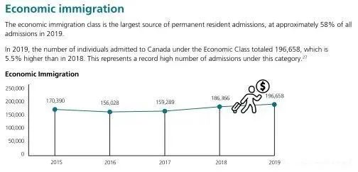 其中,經濟移民階層是移民的最大來源, 約占所有移民總量的58%, 比2018年增加5.5%。
