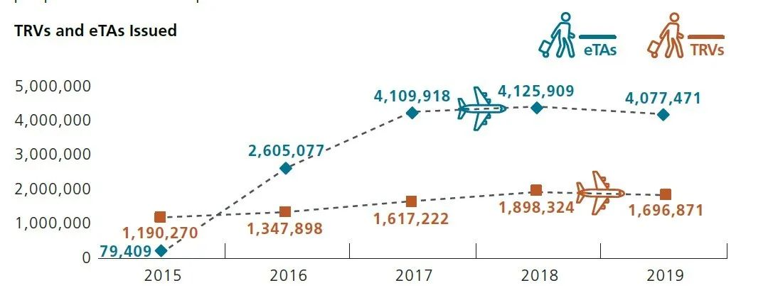 前往加拿大的訪客,包括游客、商務旅行者和其他訪客,必須獲得臨時居民證 (簽證(TRV)或電子旅行許可證。2019年度,加拿大移民部共發放將近570萬份臨時居民訪客簽證。雖然跟2018年相比有所回落,但是任然處于過去5年以來的高位。