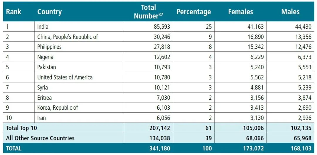 2. 中國是第二大移民來源國;