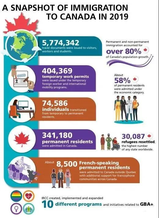 加拿大移民局共批準了5,774,342份訪客旅行證件, 其中40萬份是工作簽證,34萬份移民簽證,7萬4千人從臨時居民轉為永久居民,移民人數占全加拿大人口增長的80%,約58%的新移民屬于經濟類別。從簽證和移民的數量上看,2019年都達到了加拿大歷史新高。