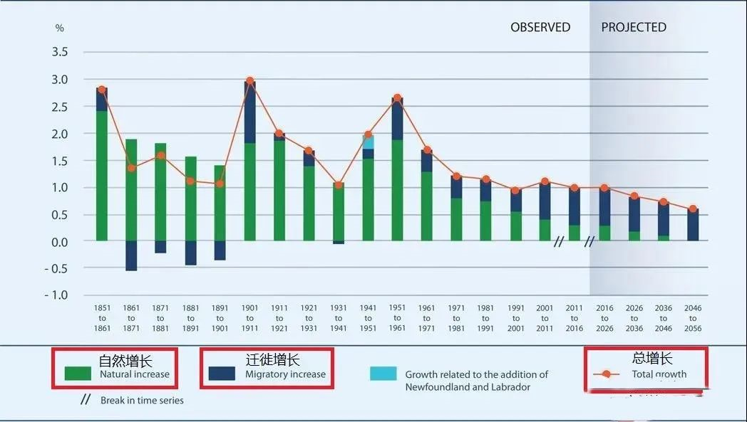 2017年至2018年,加拿大凈移民占80%加拿大的人口增長,剩下的20%則是通過自然增長。2018年之間的人口增長。高水平的移民增量幫助加拿大人口在2019年增長1.4%,是G7國家中增長率最高的國家(增長超過53.1萬人)。