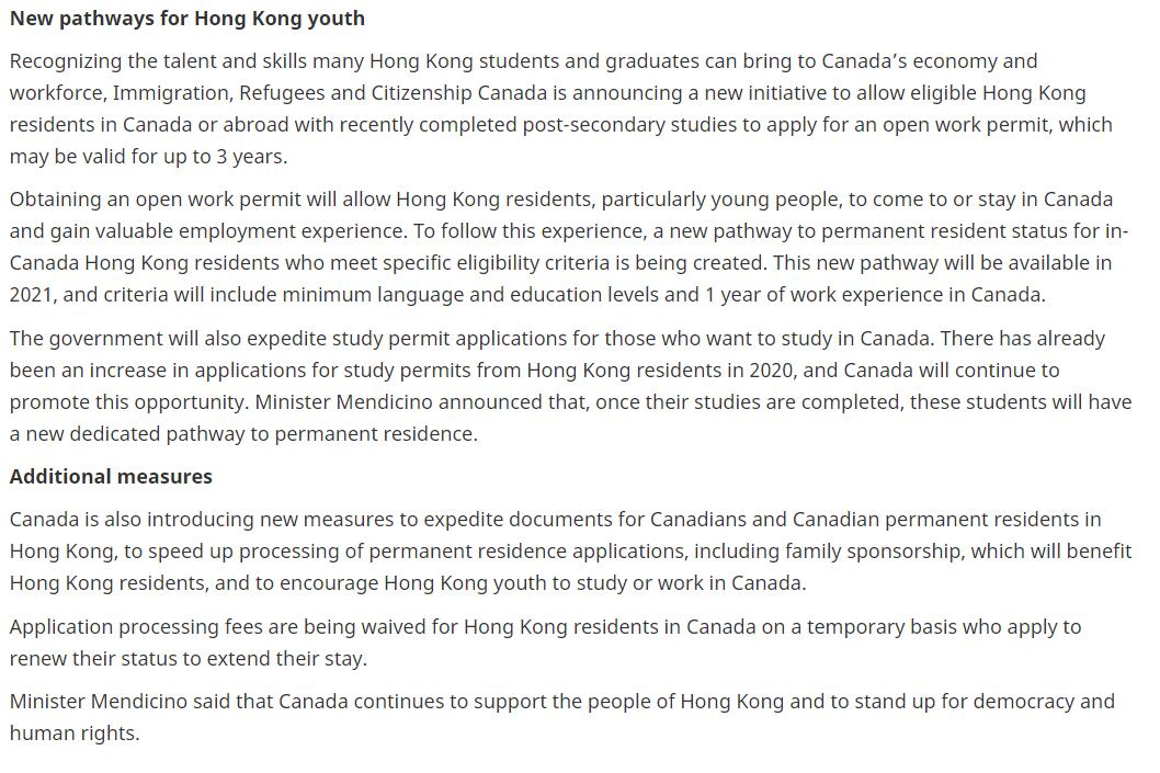 這也是公布新三年移民計劃以來的首個具體方案。該計劃以加拿大2021-2023年百萬移民水平計劃為基礎,旨在鼓勵應屆香港畢業生和具有相關工作經驗的人,選擇加拿大作為學習、作和定居的地方。