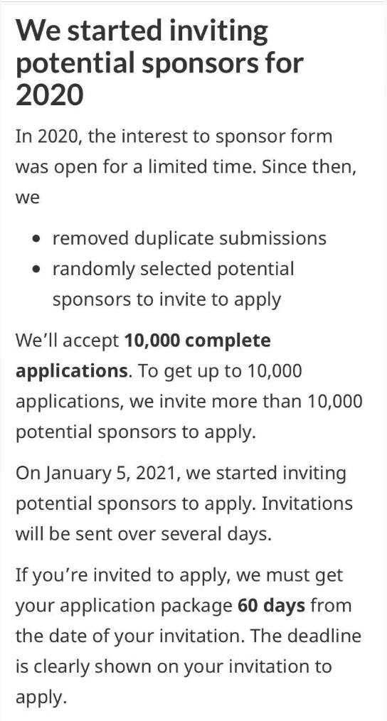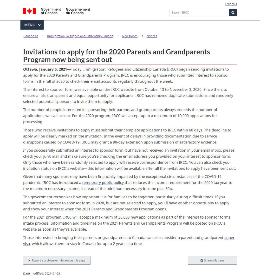 加拿大移民部于當地時間1月5日開始2020年度的父母和祖父母計劃(PGP)抽簽,總名額為10,000人。