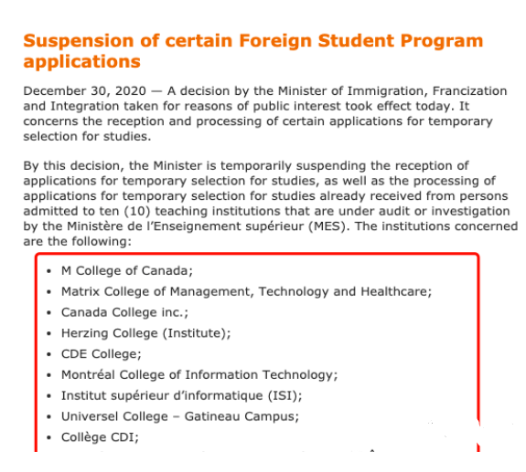 根據移民局官網給出的解釋,魁省突然要求暫停這幾所學校的CAQ申請,是因為這幾所學校在國際留學生招生方面疑似存在爭議行為,相關部門已經展開調查。