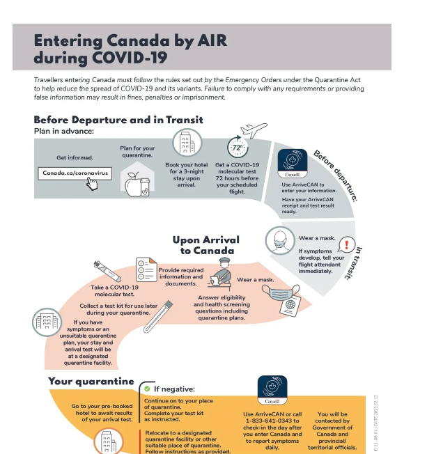 此外,旅客可能還需提前下載ArriveCAN應用程序,向邊境局官員提供登機前獲得的核酸檢測陰性證明和隔離計劃。入境加拿大的旅客將隨即在機場接受核酸檢測,并將會被強制在附近的酒店隔離3天,等候檢測結果。