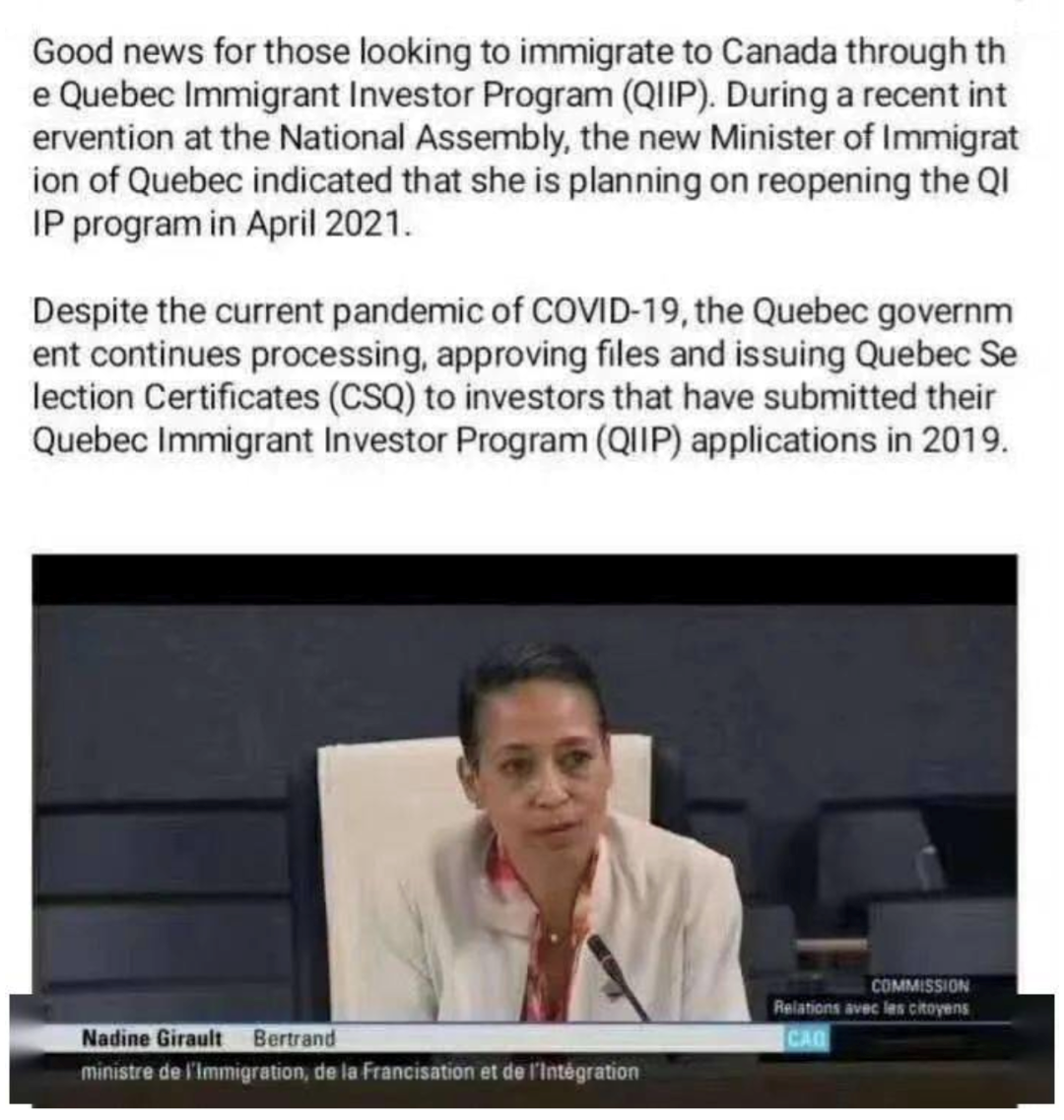 去年9月魁北克新上任的移民部長Nadine Girault她透露今年4月重開魁北克投資移民項目。