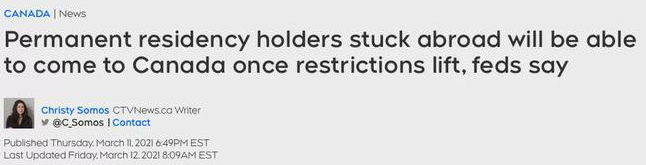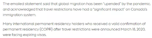 由于旅行限制而無法進入加拿大的COPR(永久居民確認信,也叫“PR登陸紙”)持有者,即使他們的COPR已經過期,也將被允許進入加拿大,順利成為移民。