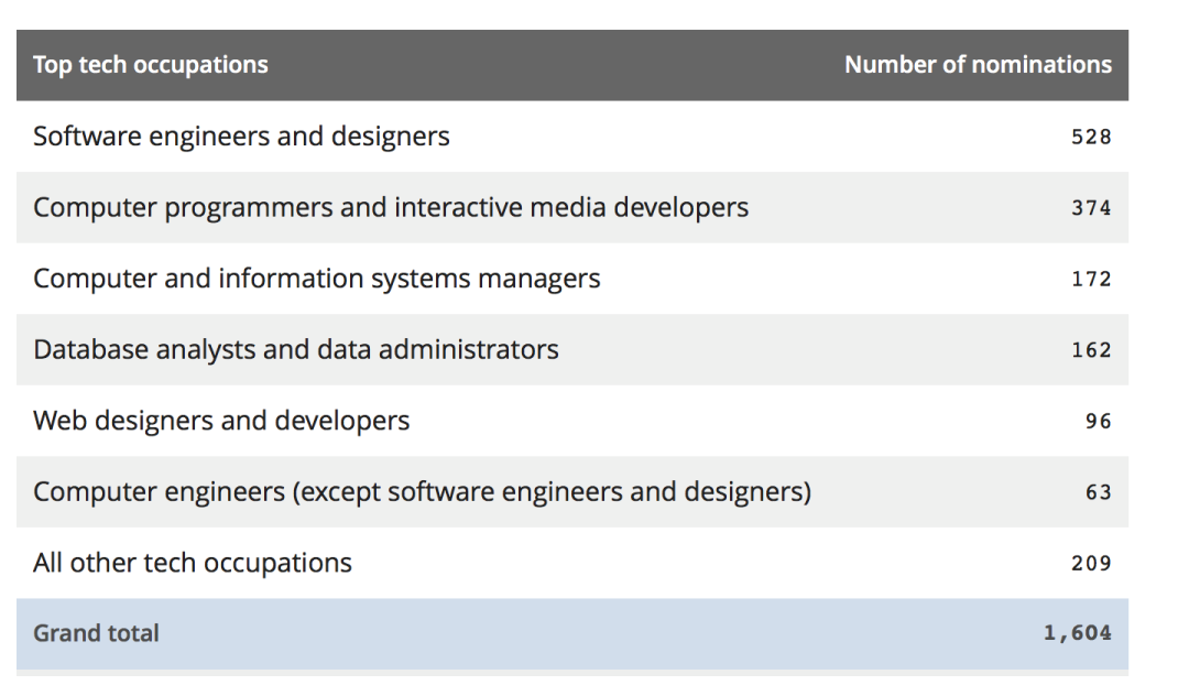 在所有提名中,大約有20%是針對在高科技行業(yè)工作的個人,共發(fā)放1,604份省提名,包括:軟件工程師和設(shè)計師、電腦程序員、互動媒體開發(fā)商、IT系統(tǒng)分析師、技術(shù)顧問。