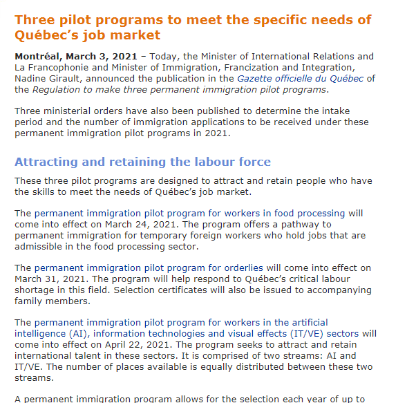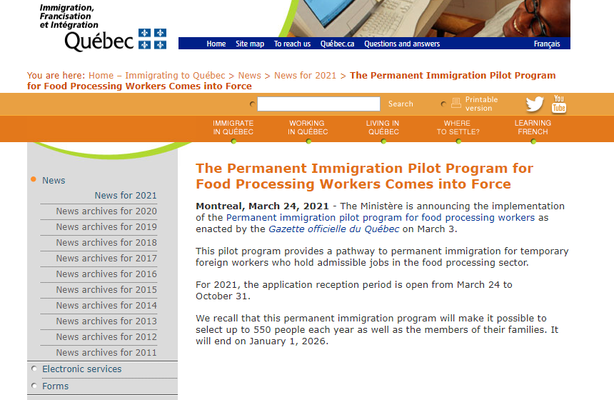 2021年3月24日魁北克省政府宣布,食品加工工人移民項(xiàng)目成為永久移民試點(diǎn)項(xiàng)目,并正式實(shí)施。