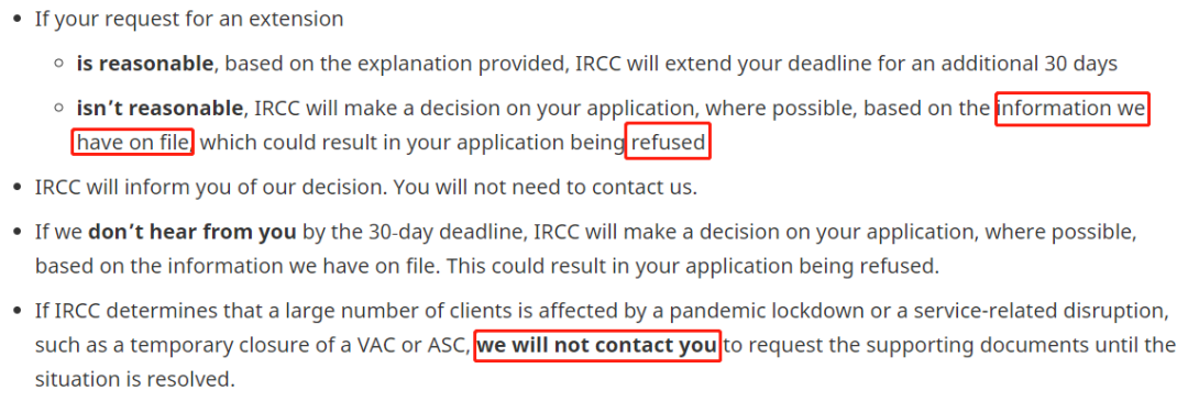 如果IRCC認為你提供的解釋是合理的,則會將你的截止日期再延長30天。如果你的解釋被認為是不合理的,IRCC將根據他們目前所擁有的信息對你的申請做出決定,這可能會導致你的申請被拒。