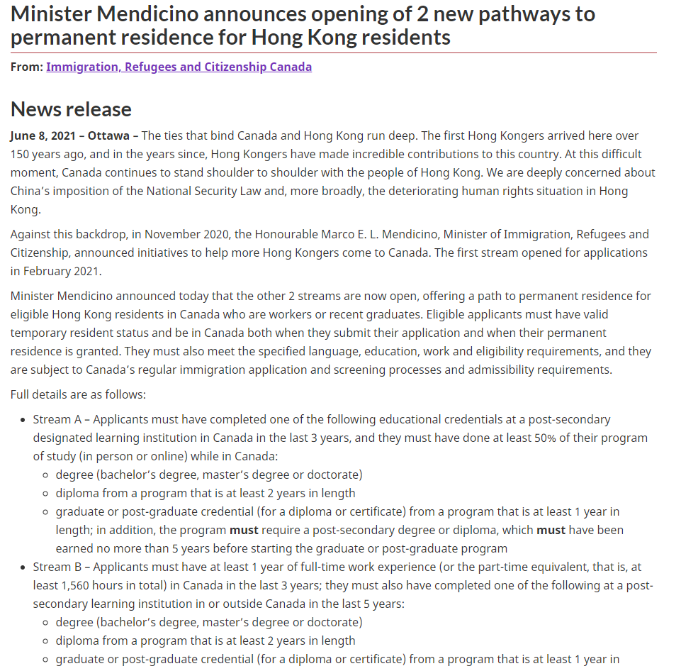 加拿大時間2021年6月8日,加拿大移民局公布了兩個針對香港居民的移民新政策,旨在為符合條件的香港工人或留學生提供了一條通往加拿大永久居留的途徑。目前,該政策已經開放,有效期至2026年8月31日,且沒有名額限制。