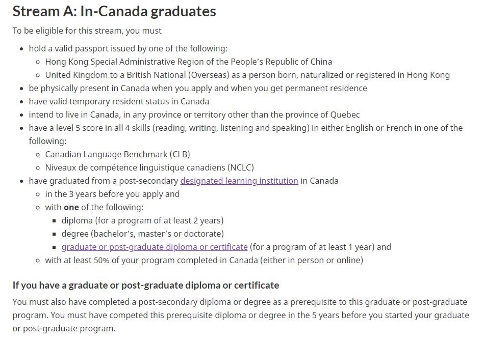 在移民局收到申請人移民申請時,申請人教育經歷方面需滿足在最近三年內從加拿大專上學院畢業,且學歷要求如下: