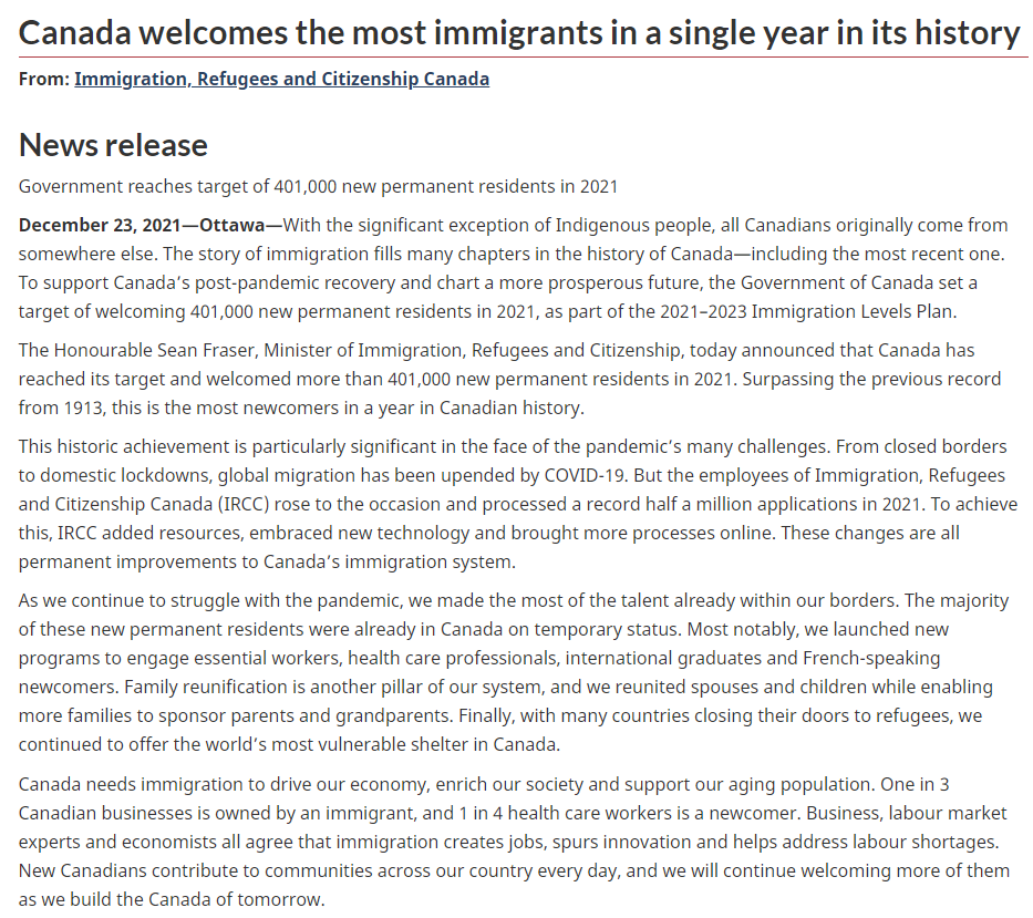 加拿大移民局今日宣布:已經(jīng)順利完成2021年引入40.1萬新移民的任務(wù),今年接收的移民數(shù)量是歷史上年度接收移民數(shù)量最多的一年!