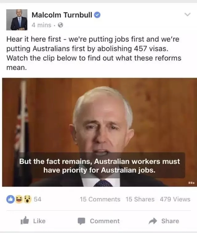重磅突發!就在中午!澳洲總理在自己的facebook主頁上發布通知:澳洲政府要廢除457雇主擔保簽證!