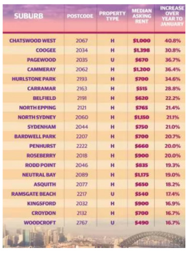 中立灣(Neutral Bay)、卡莫雷(Cammeray)、克羅伊登公園(Croydon Park)、佩吉伍德(Pagewood)、北悉尼(North Sydney)、北葉坪(North Epping)等區的房租價格也錄得逾10%的破紀錄增長。