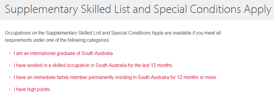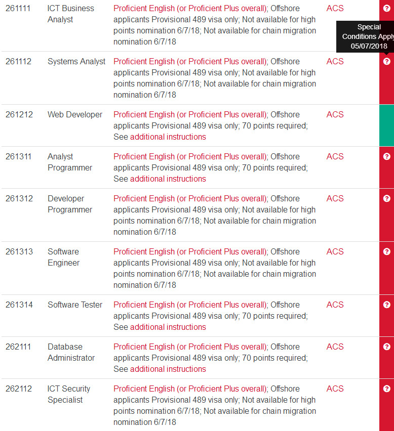 7月5日,SA發(fā)布的職業(yè)清單的涵蓋的職業(yè)依然比較廣泛,并且依然是2張職業(yè)清單。一張面向所有申請(qǐng)人開放,但由于州政府明確表示會(huì)根據(jù)申請(qǐng)數(shù)量來調(diào)整其州擔(dān)保職業(yè)清單,在開放申請(qǐng)當(dāng)天,僅僅4個(gè)小時(shí)后,就有2個(gè)熱門職業(yè)(ICT Business Analyst和 Software engineer)被調(diào)整為Special Conditions Apply狀態(tài),而截至到今天,幾乎所有的ICT相關(guān)職業(yè)和部分其他職業(yè)均處于該狀態(tài)或位于補(bǔ)充職業(yè)清單上。