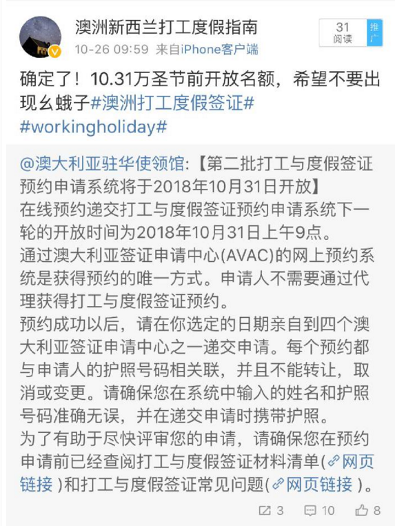 澳大利亞駐華使領館微博日前剛剛發布消息:2018-19年度第二批WHV名額將于10月31日上午9點開放(北京時間)!