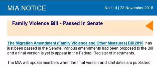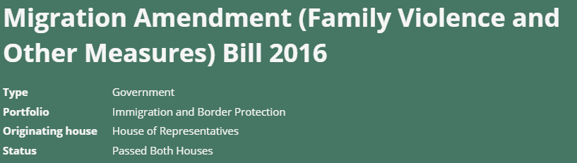 然而,聯邦議會通過了《2016年移民修正案(家庭暴力和其他措施)法案》(Migration amendment, Family Violence and Other Measures, Bill 2016)和政府修正案,并于2018年11月28日在眾議院獲得通過,為新的家庭簽證擔保框架鋪平了道路。