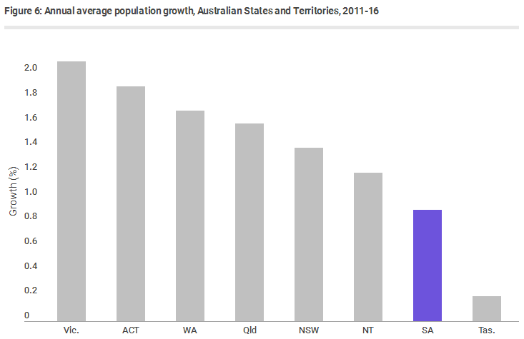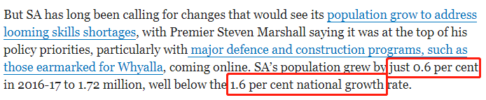 與新州,維州的人口急速膨脹不同,南澳人口一直增長(zhǎng)緩慢,據(jù)悉,2016-17財(cái)年,整個(gè)澳洲的平均人口增長(zhǎng)率為1.6%,而南澳地區(qū)僅相當(dāng)于零頭-0.6%!