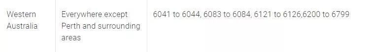 偏遠(yuǎn)地區(qū)郵編:6041 至 6044;6083 至 6084;6121 至 6126;6200 至 6799。