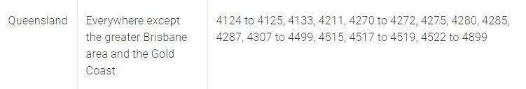 偏遠(yuǎn)地區(qū)郵編:4124 至 4125;4133, 4211;4270 至 4272;4275,4280,4285,4287;4307 至 4499;4515;4517 至 4519;4522 至 4899。
