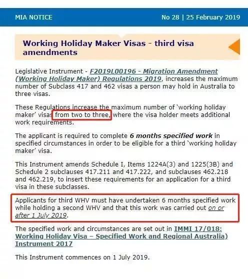 根據立法文書-F2019100196-移民修正案,本政策一旦實施,持此簽證的背包客只要在指定地區工作滿6個月,有可以續簽第三年打工度假簽證!另外第三年簽證的指定工作與第二年簽證的指定工作資格相同。除此喜訊之外,還有更多相關政策變化。