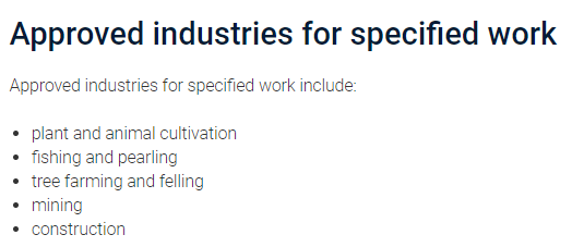 下面這些工作是符合續三簽要求的specified work。包含了5大行業:動植物栽培,漁業,植樹伐木,采礦和建筑行業。