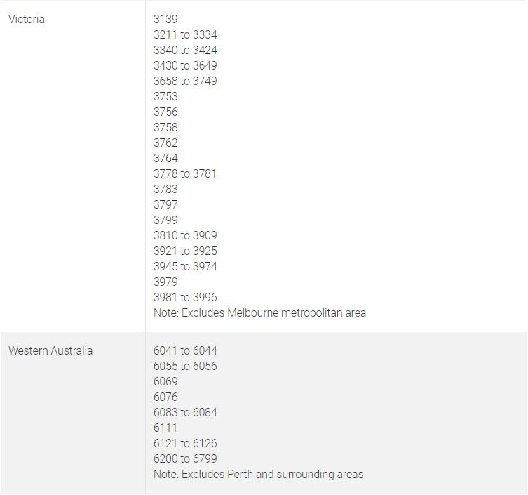 這些地區都用郵編代表,有一些是給出一個范圍,比如“2328 to 2411”,那就是2328,2329,2340,2341都是指定地區。