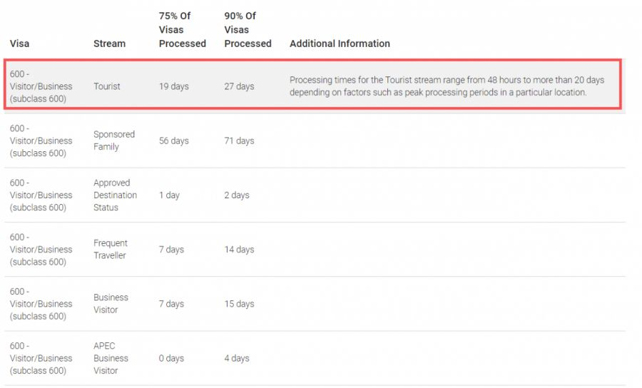 大部分人會申請的600旅游簽證,75%的審理期需要19天,90%的審理期需要27天,與上個月持平。