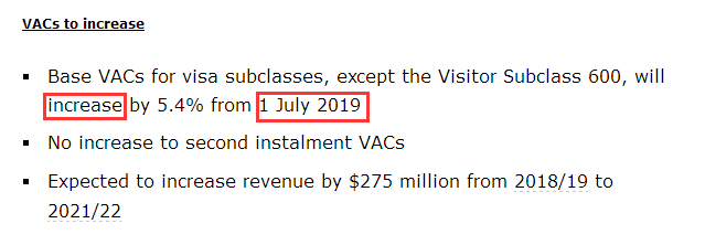 從2019年7月1日起,除600旅游簽外,其他所有簽證的申請費將增加5.4%。不增加二次簽證費(Second instalment VACs)