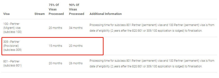 境外配偶309簽證:75%的審理時間需要15個月,比上次更新慢了一個月;90%的審理時間仍然需要20個月。