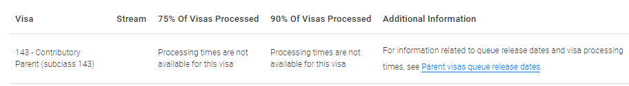 143父母移民:143簽證的審理時間依舊是not availiable,上次有更新時還停留在75%的審理時間需要43個月,90%的審理時間需要46個月。