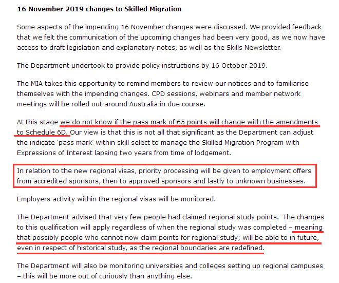 ③關于偏遠地區學習加分:由于11月16號后澳洲會重新定義偏遠地區,除了悉尼、墨爾本、珀斯、布里斯班、黃金海岸這五大城市外的地區都屬于偏遠,MIA來信中說到:內政部明確表示目前claim偏遠地區學習5分加分的人較少,新政實施后就算是之前在新定義下偏遠地區學習且已經畢業的,在現有偏遠地區定義下不能加分的同學,之后也能claim這個五分加分。