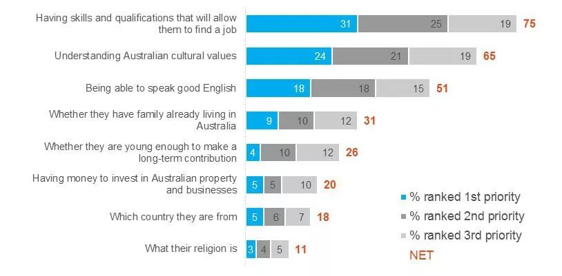 民意調(diào)查結(jié)果顯示,絕大多數(shù)澳大利亞人認為移民獲得工作的能力遠比他們的宗教或原籍國重要。四分之三的受訪者稱:“擁有能夠找到工作的技能和資質(zhì)”是決定是否允許某人移居澳大利亞三大優(yōu)先考慮事項。其中,近三分之一將其列為八項標準中最重要的決定因素。
