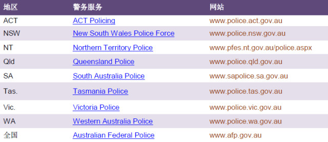 對于非緊急事件,請致電13 1444或您當地的警察局,各警察局地點在 White Pages的“警察局”部分列出。警察服務是免費的。