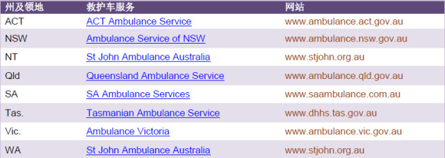 在緊急時,如因重病或受傷而需要立即醫治,請撥打000然后要求“Ambulance”。救護車可以提供緊急送院和即時救護服務。
