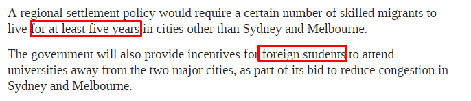 這份新的計劃不但對留學生下手了,對技術移民也沒有放過!在過去的財年中,有112,000人通過技術移民獲得澳洲PR,而在這些中,高達87%的人選擇定居悉尼和墨爾本。然而現在,想要移民,對不起,請先去偏遠地區!這一新出臺的區域定居政策明確要求: