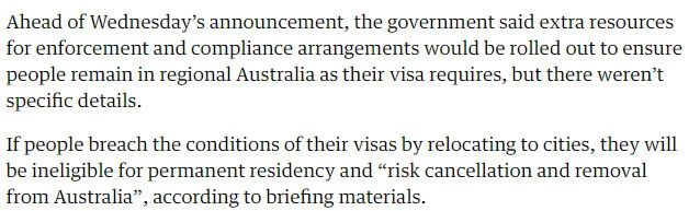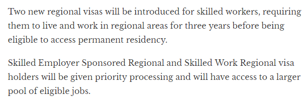 有一定數量的技術移民必須在悉尼和墨爾本以外的偏遠地區定居至少三年!新的偏遠地區簽證將要求申請人在偏遠地區居住3年后才可申請永居。政府可能會引進更多的職業給偏遠地區州政府擔保。