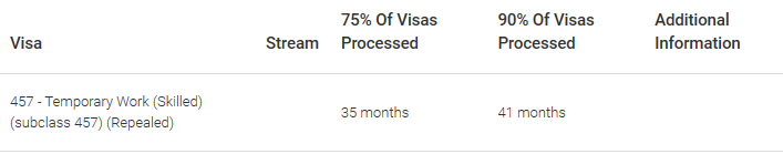 ◆ 經歷了一場變革的457雇主擔保簽證,由于申請的人太少,前幾輪都沒有數據。這次顯示75%的審理期需要35個月,90%的審理期需要41個月。