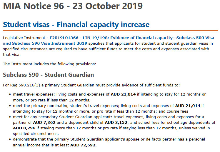 根據(jù)最新MIA notice,澳大利亞立法條約對赴澳洲留學的資金要求作出了新的規(guī)定,涉及500學生簽和590監(jiān)護人陪讀簽證,包括主申請人和副申請人的要求。