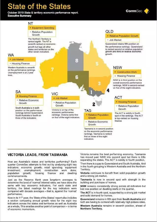 聯(lián)邦證券(CommSec)最新公布的《全澳各州經(jīng)濟(jì)表現(xiàn)報(bào)告》,使用了8個(gè)指標(biāo)來判斷各州和行政區(qū)的經(jīng)濟(jì)表現(xiàn),維州在經(jīng)濟(jì)增長(zhǎng)、零售貿(mào)易、就業(yè)市場(chǎng)和建筑施工方面排名第一。新州在一系列指標(biāo)上也有穩(wěn)定的發(fā)展,但新州確實(shí)在相對(duì)人口增長(zhǎng)和新住房開工方面卻有所下降。塔州在相對(duì)人口增長(zhǎng)速度、新住房開工以及設(shè)備投資三個(gè)方面排名第一。此外,塔州在失業(yè)率方面也有所改善。