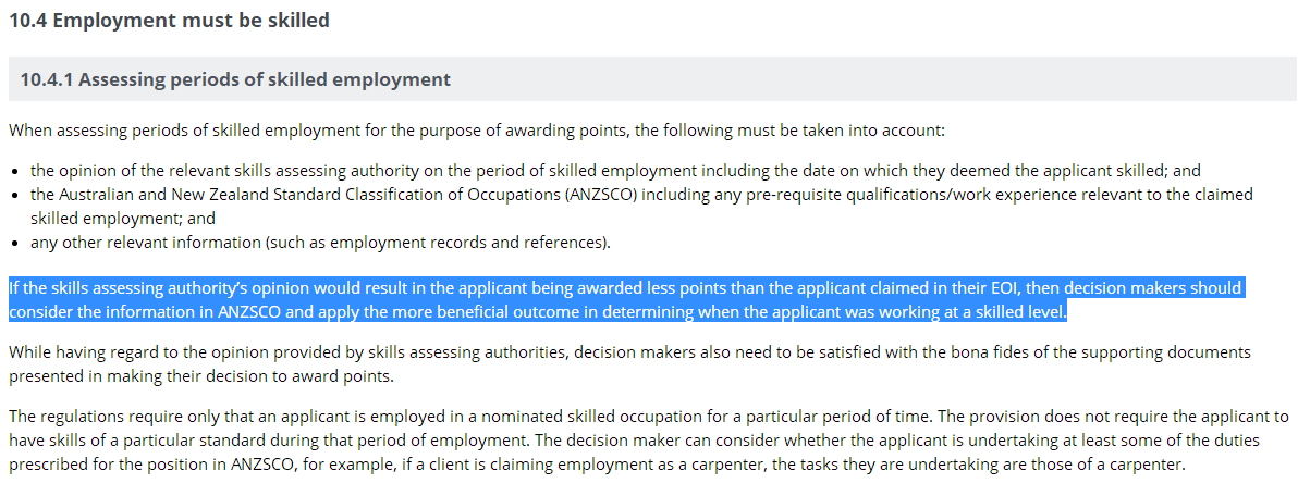 當職業評估機構對于工作經驗加分的意見會使申請人Claim EOI分數更低時,那么移民局將會采信ANZCO的意見給申請人更多的分數。