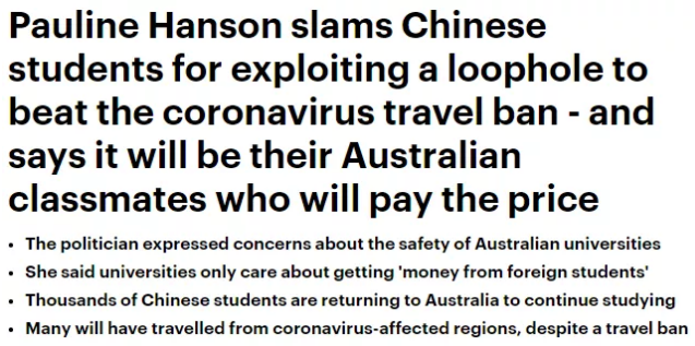 澳洲政治家保林·漢森(Pauline Hanson)就公開抨擊了中國學生,因為他們利用合法漏洞在冠狀病毒爆發期間潛入澳大利亞。